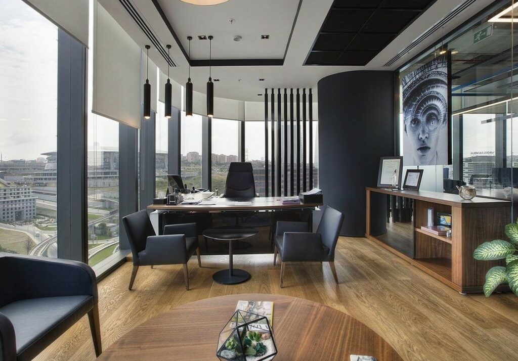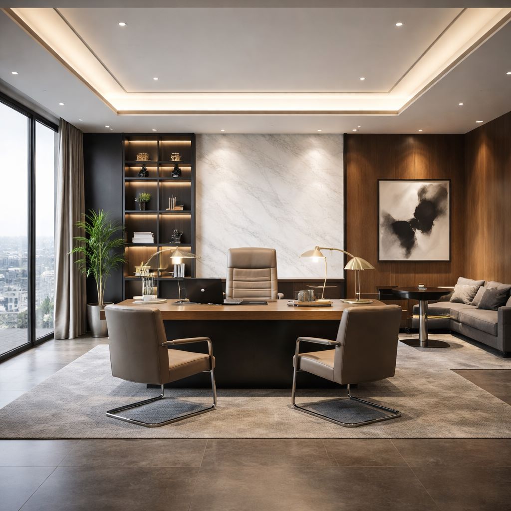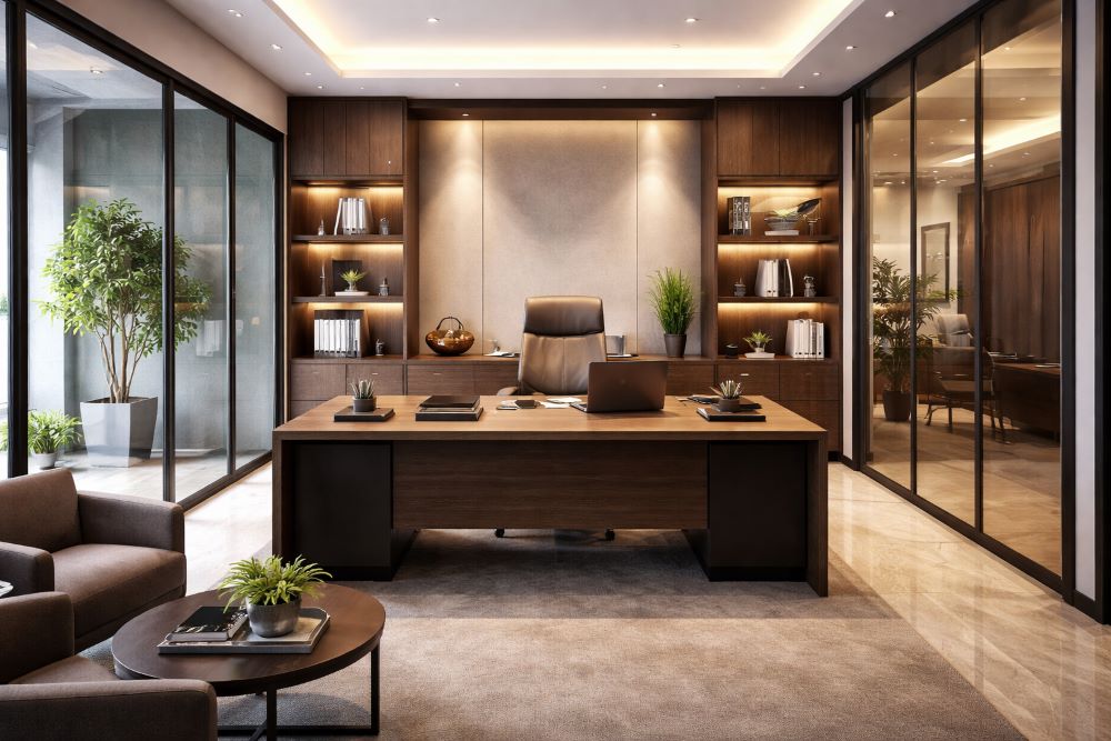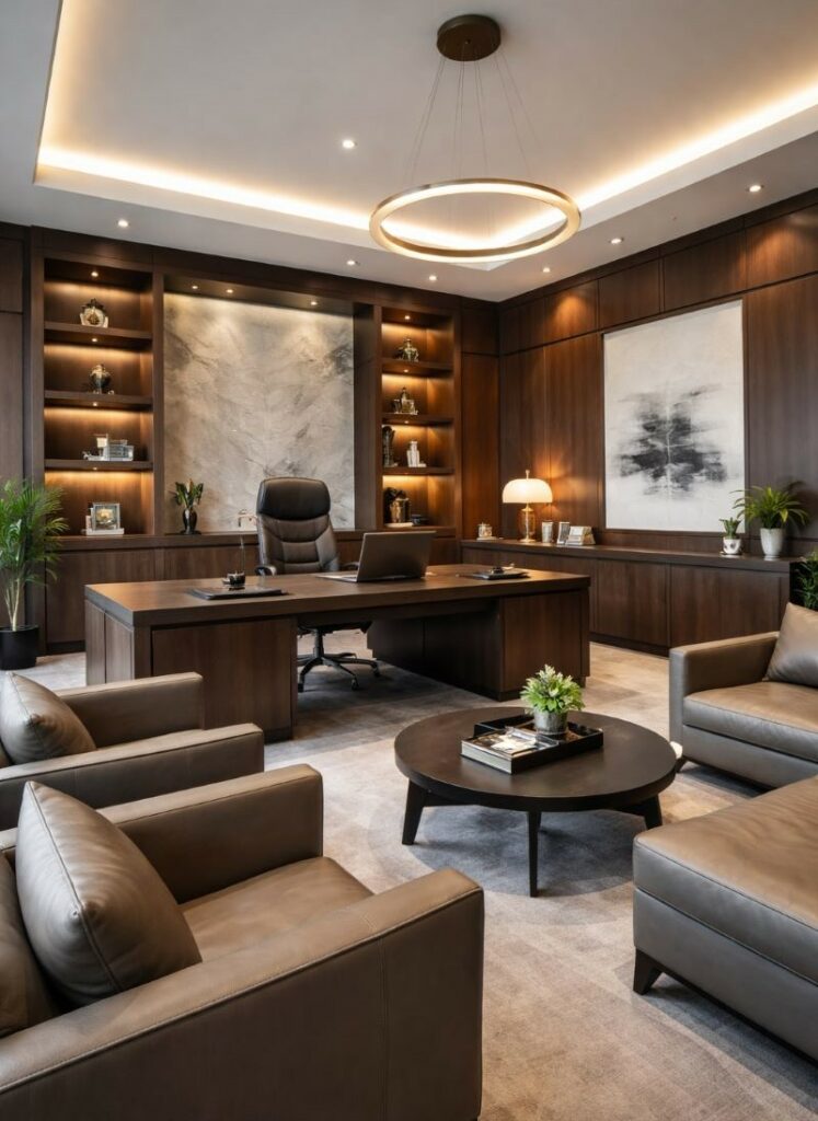 Wooden accents, leather furniture, warm lighting, and premium finishes create a sophisticated executive environment.