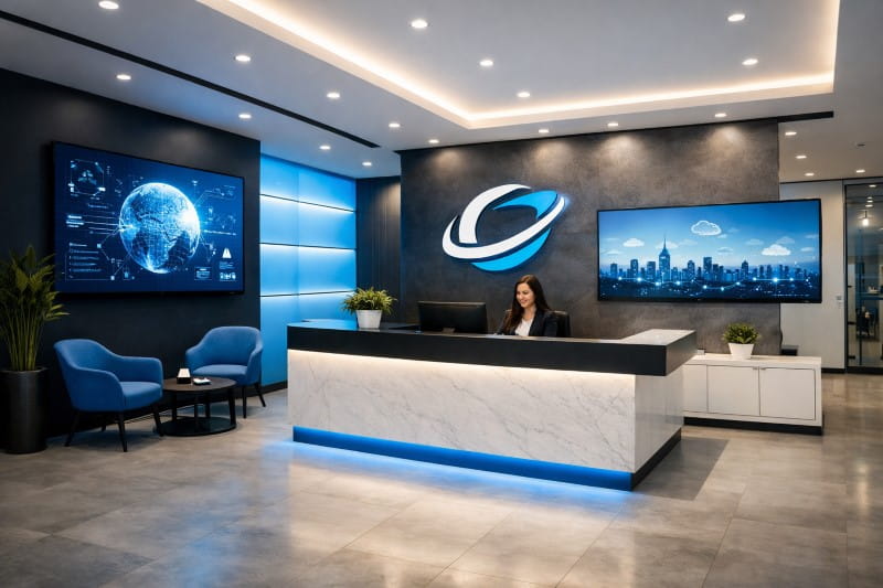 The reception area reflects your brand identity. Use modern furniture, digital screens, brand colors, and minimalistic décor to create a strong first impression.