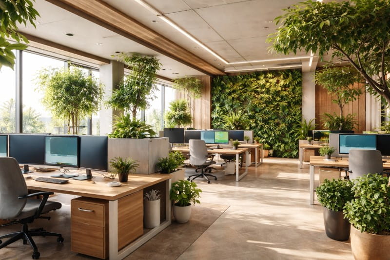 Natural light improves mood and reduces eye strain. Adding indoor plants, green walls, and wooden finishes enhances air quality and boosts creativity. Biophilic design has become a favorite among IT office interior professionals.