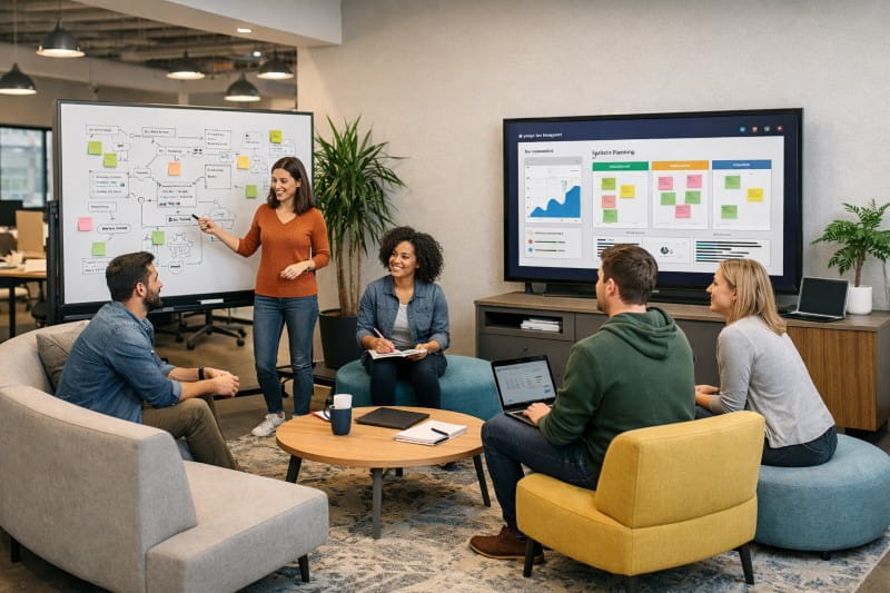 Instead of always reserving conference rooms, create open collaboration corners with whiteboards, soft seating, and screens. These hubs support brainstorming, sprint planning, and team standups.