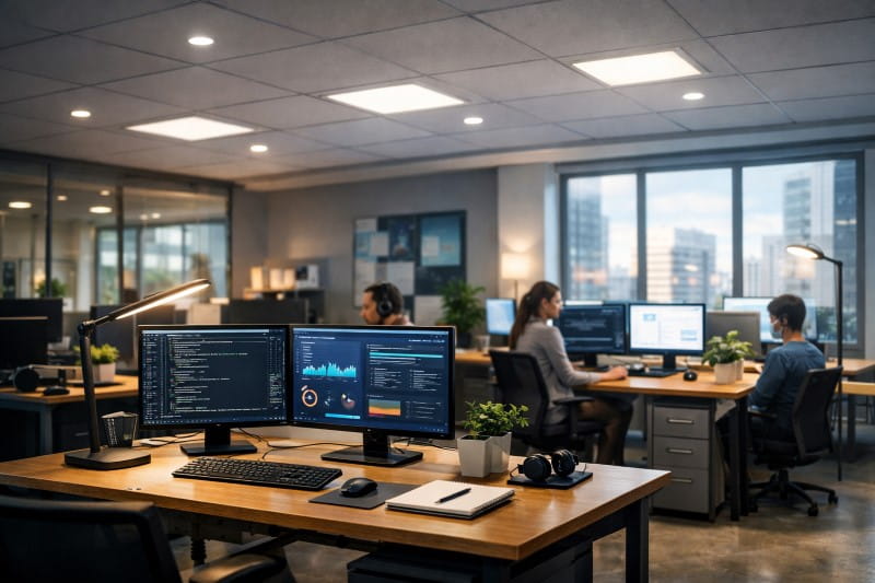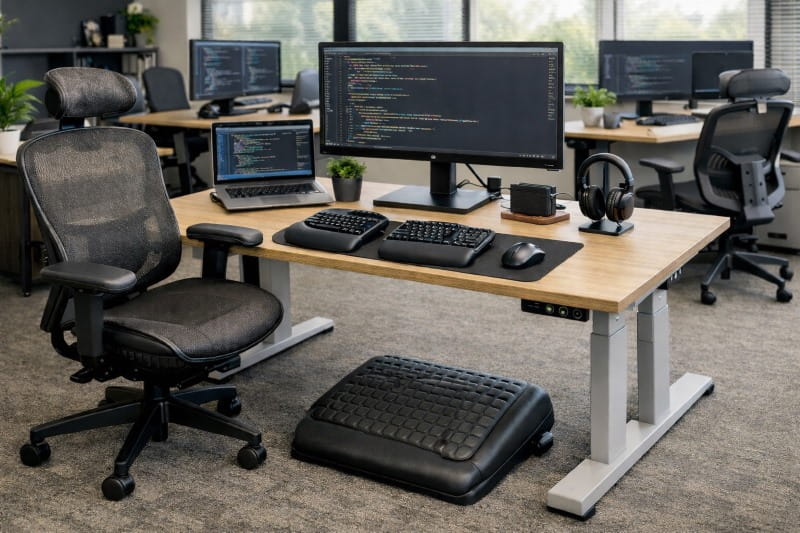 Ergonomic chairs, adjustable desks, wrist-friendly keyboards, and footrests are essential in any IT office. Good posture improves performance and reduces fatigue, especially during long coding sessions.