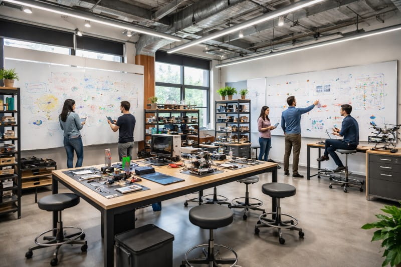 Special innovation rooms encourage brainstorming and experimenting. Add writable glass boards, prototypes, tools, and flexible furniture to support creativity.