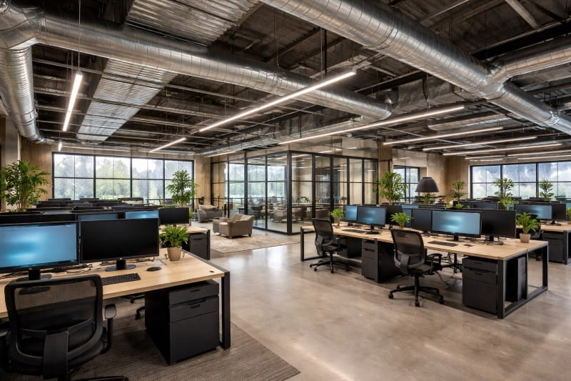 Exposed ceilings, metal ducts, and raw finishes add a modern industrial touch. This design is popular in IT spaces because it looks stylish and allows easy access for electrical and network upgrades.