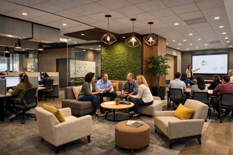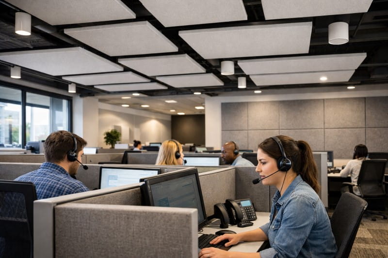 In call centers, noise control is critical. New acoustic strategies include sound-absorbing ceiling panels, targeted carpet zones, and background sound masking systems that help reduce call distractions and improve agent focus