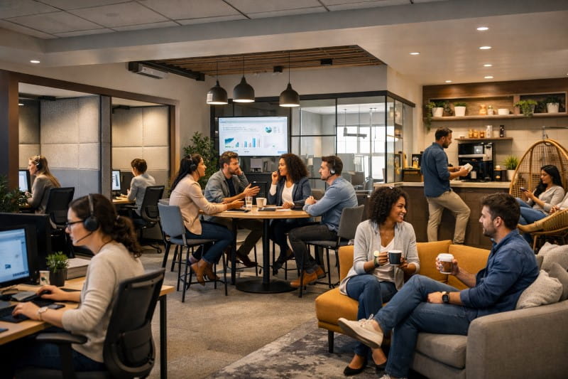 In line with broader office trends, designing workspaces around activity types — such as focus zones, collaboration hubs, and refresh zones — helps agents choose the environment that suits their task.