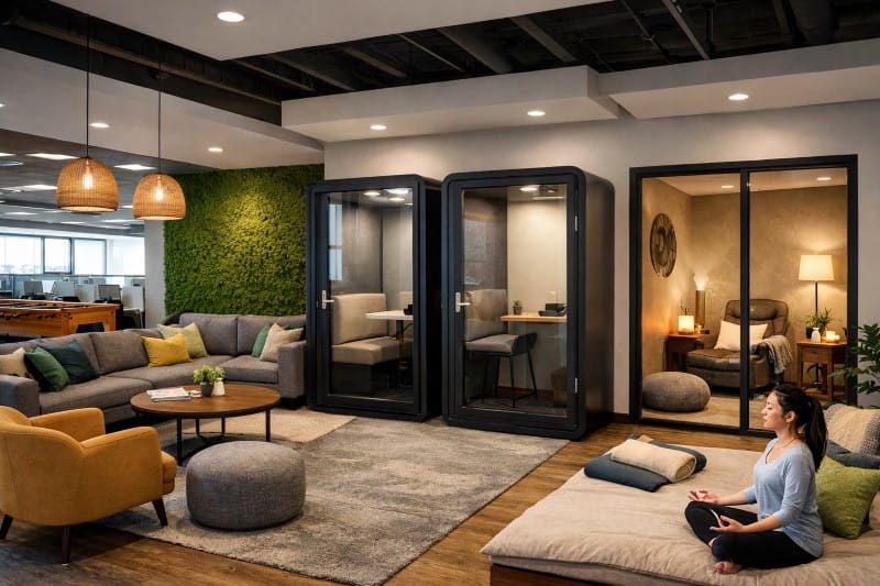 Modern call center office design ideas often include dedicated breakout spaces that let agents relax, recharge, or have informal conversations. Comfortable lounge seating, soundproof pods, and dedicated wellness rooms help employees relax, recharge, and maintain a healthy work-life balance.