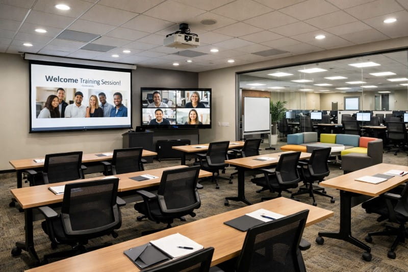 Dedicated training spaces with flexible seating and AV systems are now integrated into call center office layout plans. These areas support onboarding, skills development, and periodic group training without disrupting core operations.
