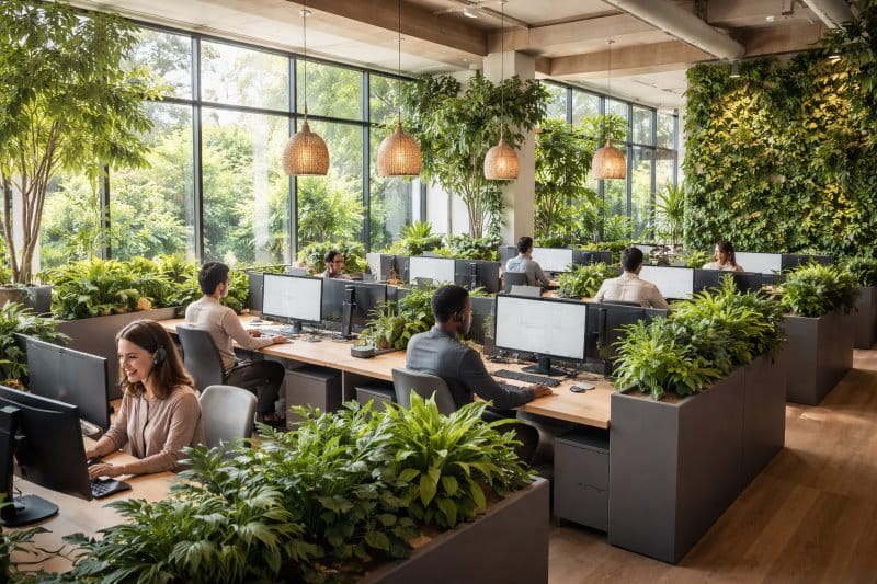 Natural lighting and greenery improve mood and reduce strain. Incorporating plant partitions, green walls, and generous windows helps bring the outdoors inside — a staple of modern call center office design.
