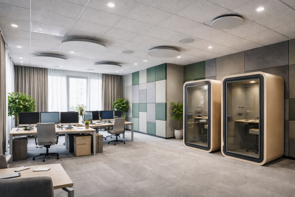 Noise can disturb productivity, especially in open offices. Modern offices use acoustic solutions to maintain peace.