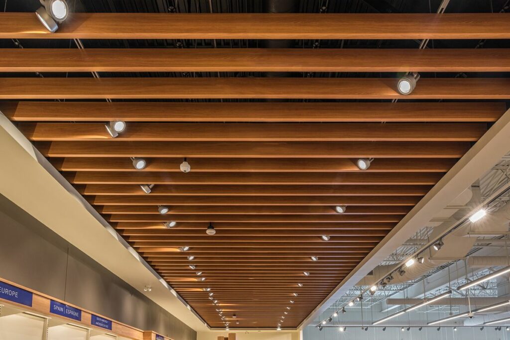 Wooden slats provide both visual appeal and acoustic benefits.