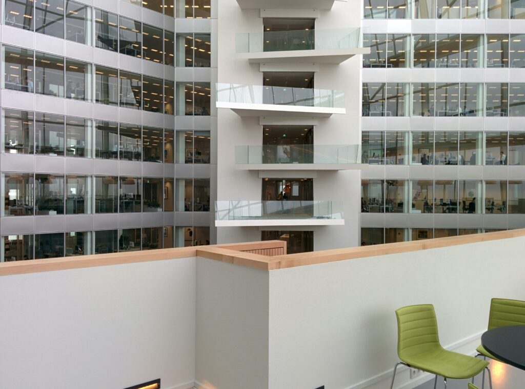 Balconies with glass railings maintain transparency, openness, and modernity. They offer functional outdoor spaces for employees while enhancing the overall façade aesthetics. Glass railings allow light to pass through, preserve sightlines, and blend seamlessly with contemporary building materials, creating a visually lightweight structure.