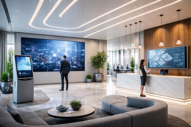 Tech-enhanced office reception design ideas offer a futuristic and efficient experience.