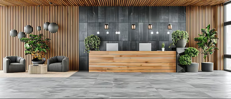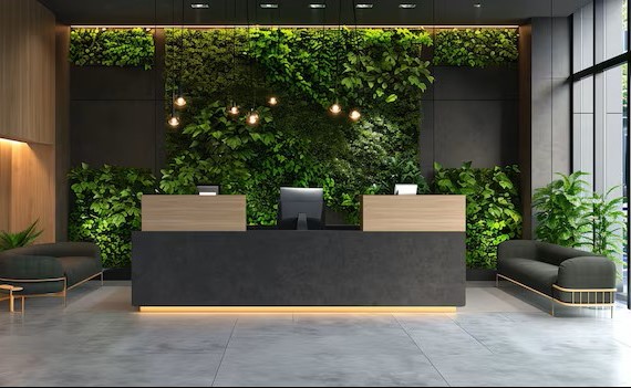 Biophilic office reception design ideas enhance relaxation and reduce stress.