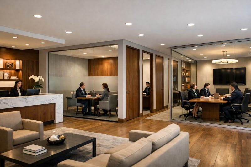 The reception sets the first impression. A well-organized reception with comfortable seating, subtle branding, and neutral colors reflects trust and professionalism. In modern law office design, reception areas are clean, minimal, and welcoming without being overly decorative.