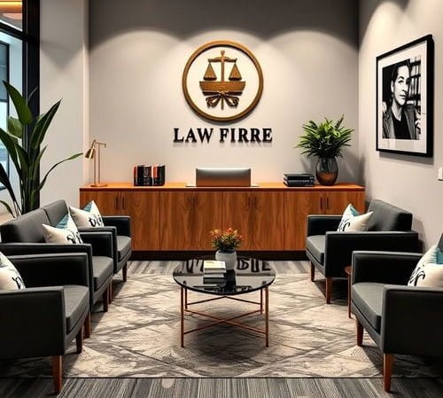 Neutral tones like beige, grey, brown, and white dominate law office design because they convey seriousness and reliability. High-quality materials such as wood, glass, and stone enhance durability and reflect the firm’s credibility.