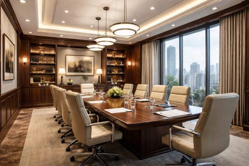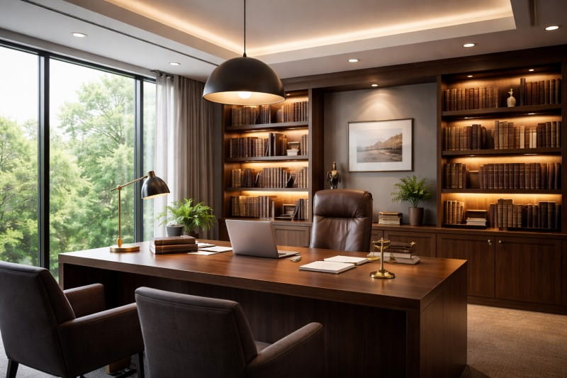 Balanced lighting is crucial. Natural light combined with well-placed artificial lighting improves concentration and reduces fatigue. In modern law office design, layered lighting—ambient, task, and accent—is widely preferred.