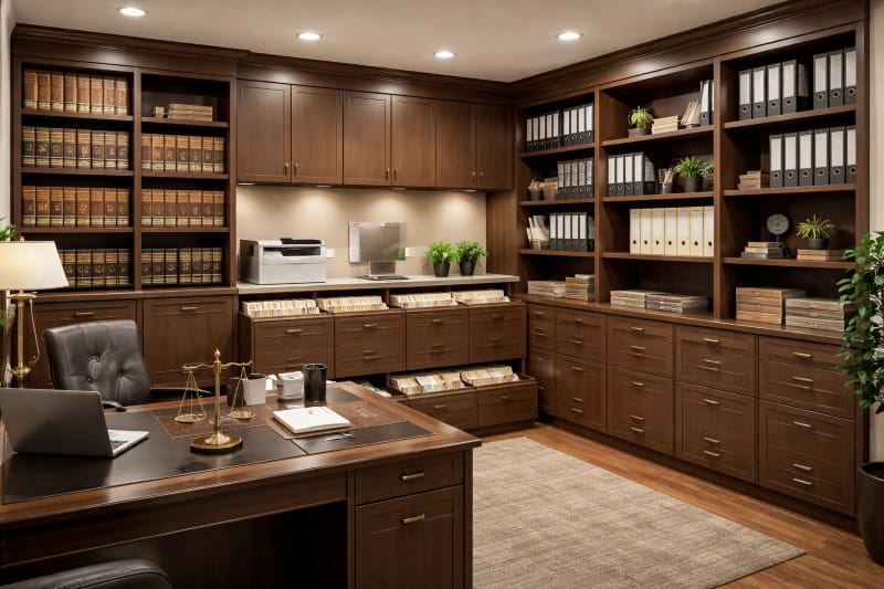 Legal offices deal with extensive paperwork. Built-in cabinets, wall storage, and secure filing systems are essential in legal office interior design. Organized storage keeps the office clutter-free and supports faster access to documents.