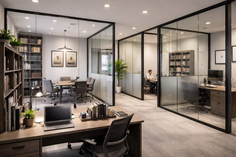 For compact offices, smart layouts matter even more. Glass partitions, multi-purpose rooms, and vertical storage help small law firm office design feel open, professional, and efficient without compromising privacy.