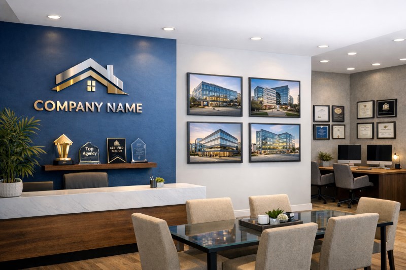 Strong branding creates a memorable real estate office interior.