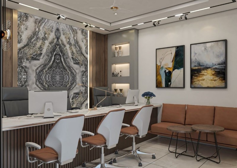 Balanced colors enhance the overall interior design for real estate office.