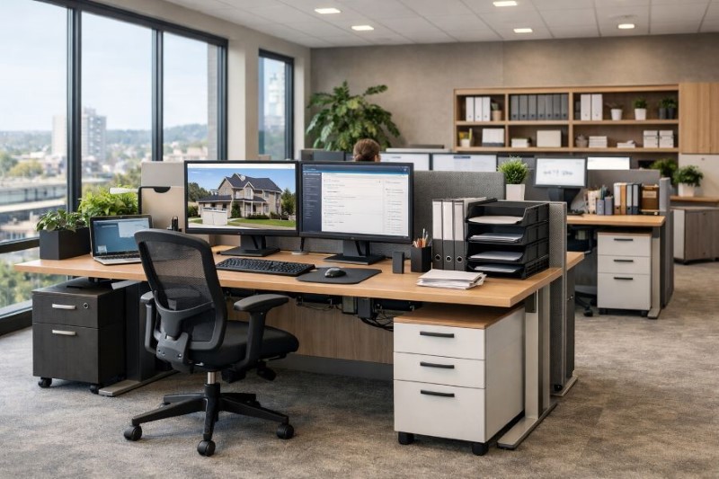 Functional workstations support efficient real estate office design.