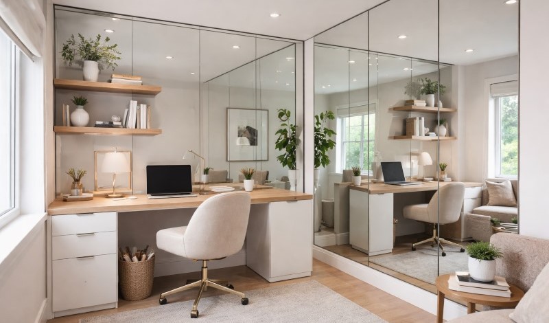 Mirrors reflect light and create an illusion of space—one of the simplest yet smartest small office interior design ideas.
