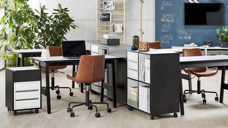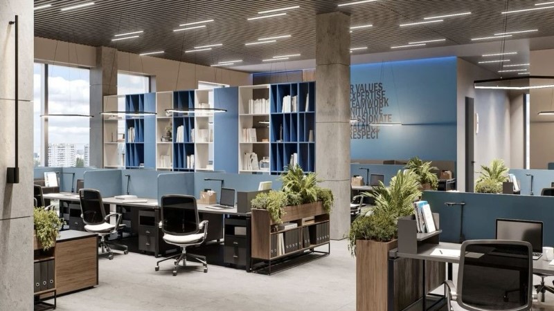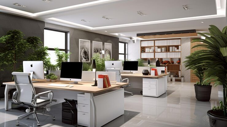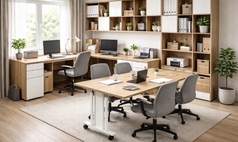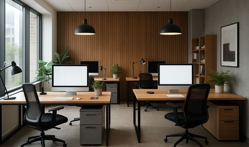 Opt for desks with built-in storage, foldable tables, or modular units. Multi-purpose furniture is essential in modern small office design ideas.
