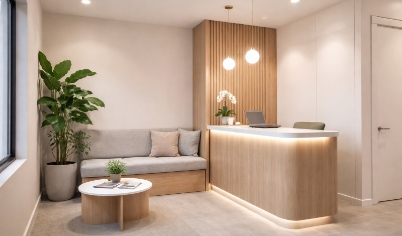 A sleek reception counter, a small seating bench, and good lighting can create a welcoming space without occupying much room.