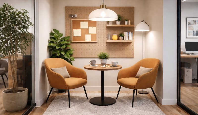 If you don’t have space for a full meeting room, create a cozy corner with two chairs and a small table. It enhances collaboration without using too much space.