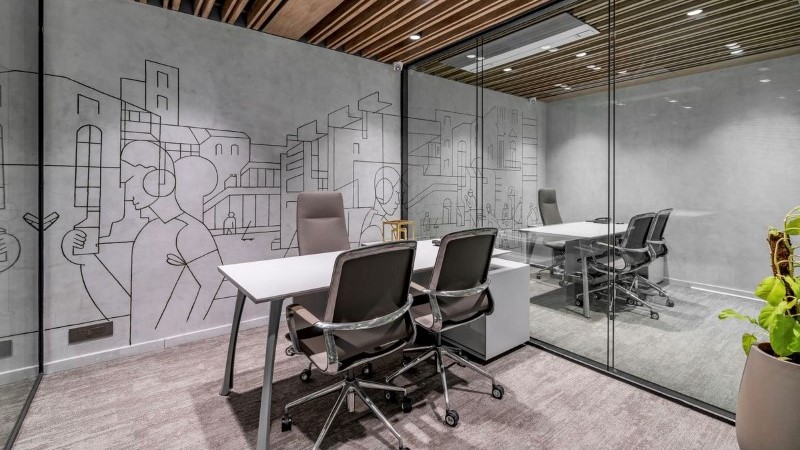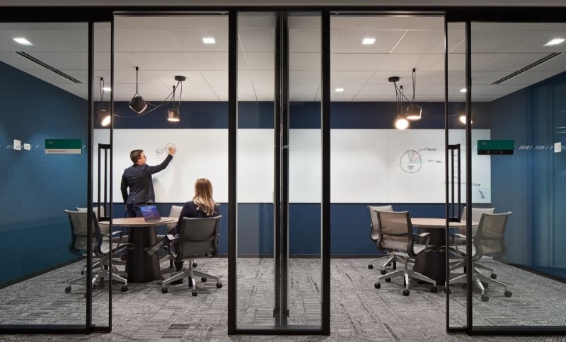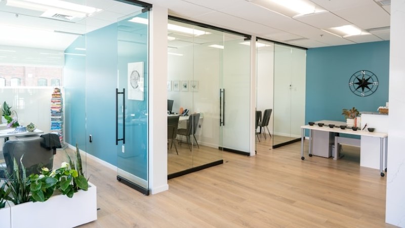Glass partitions create division without blocking light. This trick opens up the space, making small offices feel open and airy.