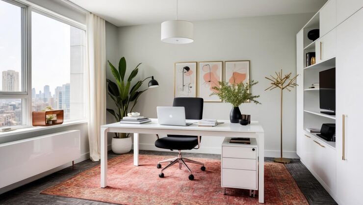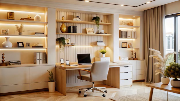 Minimalism is one of the most effective small office interior design ideas because it reduces clutter and makes your space look larger. Choose fewer but high-quality furniture pieces and keep surfaces clean.