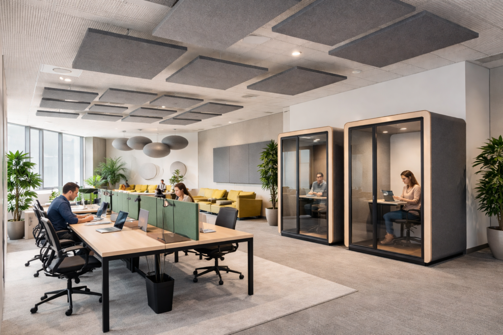 Open layouts are great, but noise can be a challenge. Offices now use acoustic panels, quiet pods, and sound-absorbing ceilings to reduce distractions. This makes deep work easier without losing the benefits of an open design.