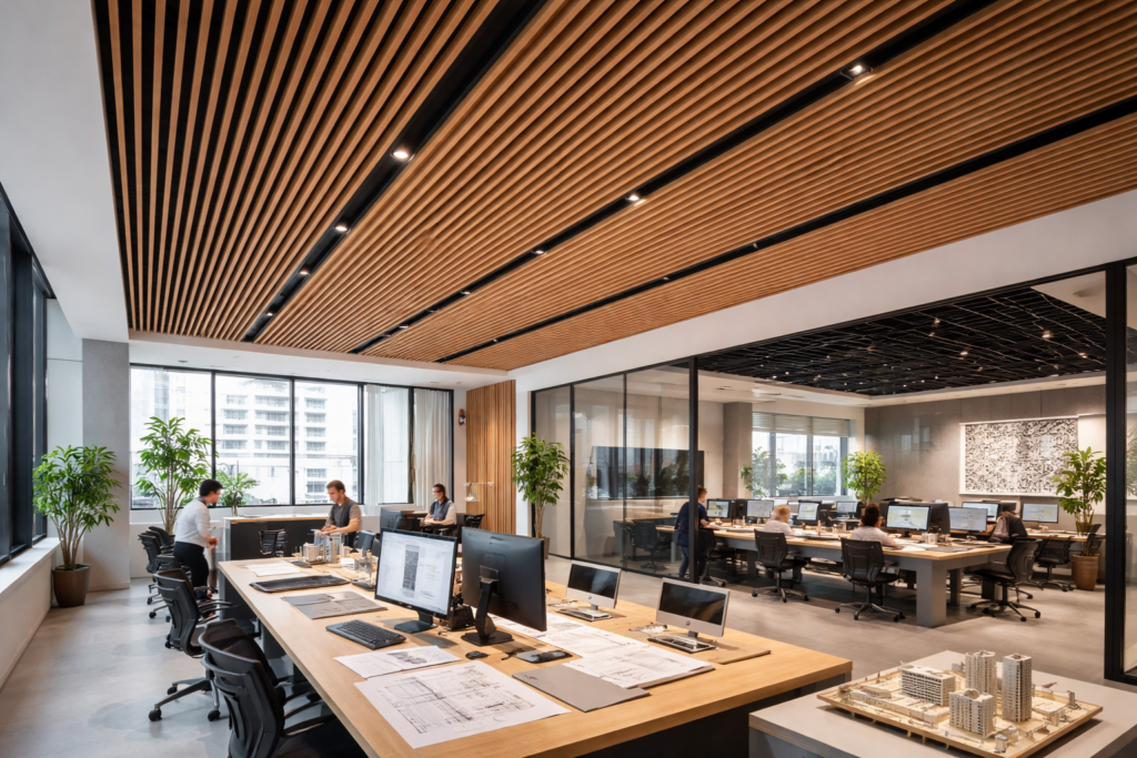Ceilings are gaining attention as a design feature. Architects are using textured timber slats, acoustic grids, or bold colors overhead to add depth and character without crowding the floor plan.