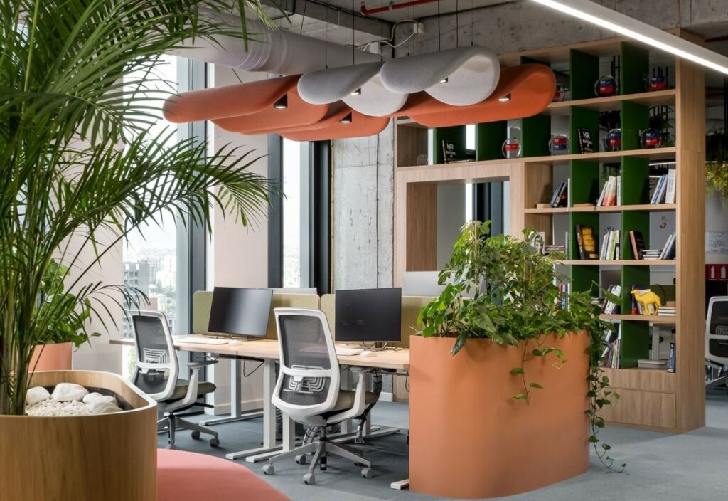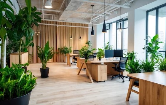Bringing nature indoors is a major trend in office interior design. Including indoor plants, vertical gardens, and natural materials like wood or stone creates a refreshing atmosphere that reduces stress and boosts focus — essential in high-thinking environments.