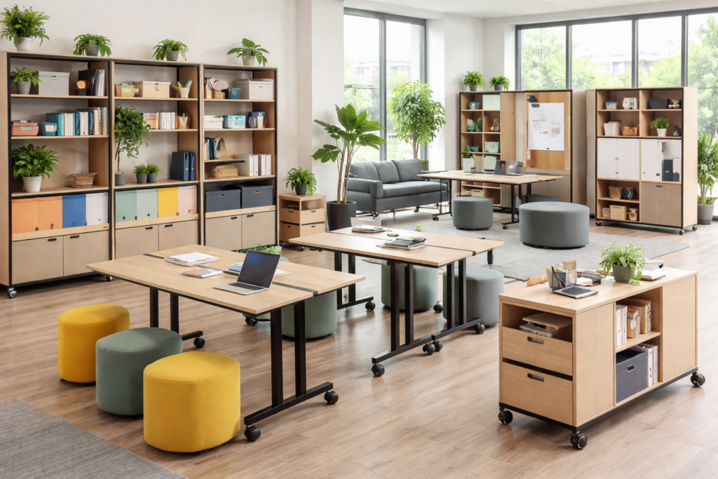 Modular furniture and smart storage solutions keep the office adaptable without clutter. Rolling tables, movable shelves, and hidden storage ensure the layout can evolve with project needs.