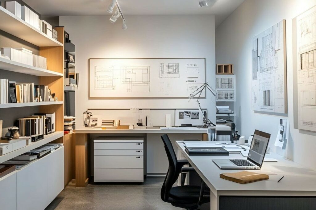 Built-in cabinets, open shelving, and vertical storage help organize drawings, samples, and tools. Efficient storage is crucial for a clutter-free architect office interior design.