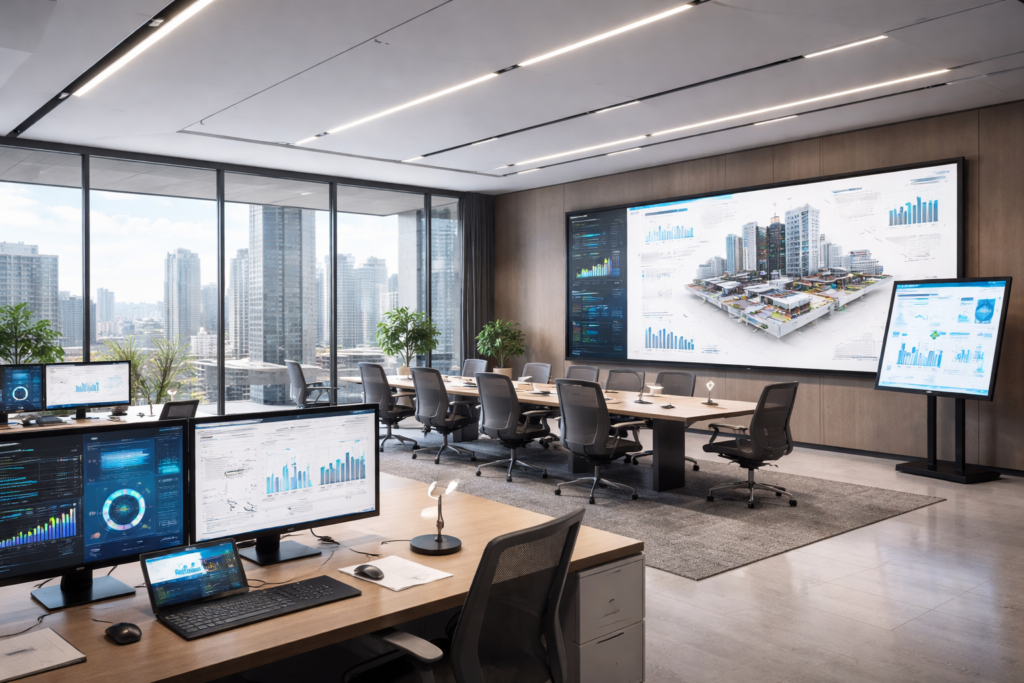 Incorporate smart lighting, digital screens, and project display systems. Technology integration supports modern architectural workflows and presentations.