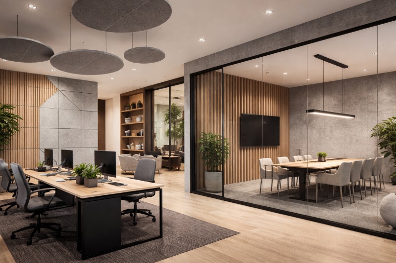 These materials help minimize echo and background noise — especially useful in meeting rooms, open work areas, and collaborative zones — while also adding textured, contemporary finishes to walls or ceilings.