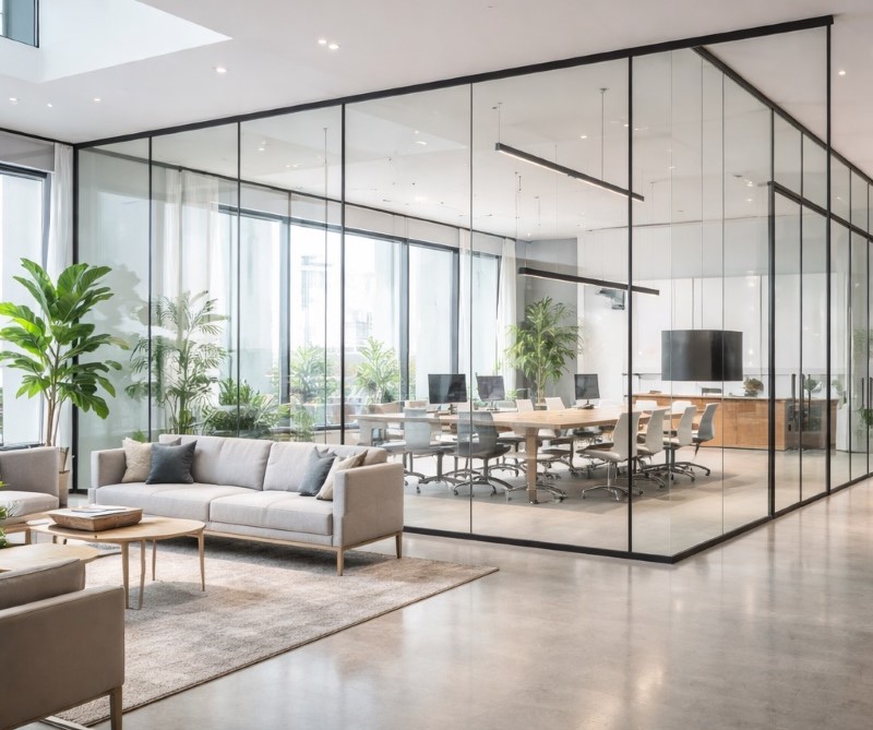 Glass remains a powerhouse material for contemporary workplaces. Using glass partitions, full-height windows or glazed doors gives a sense of openness while letting natural light permeate deep into the office.