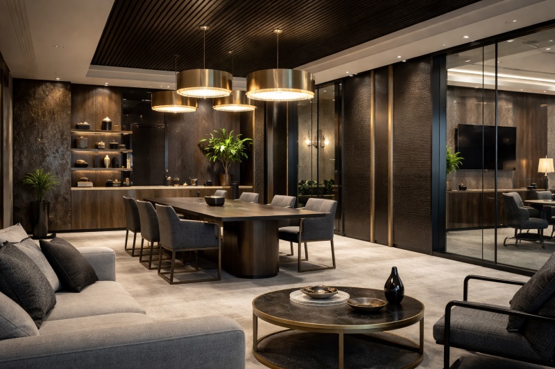- Layer textures and finishes: For instance, a wood floor, metal furniture legs, acoustic fabric panel walls, and green plants — this layered approach adds depth and sophistication.
