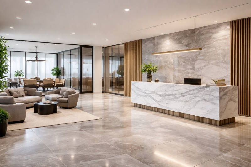 Besides aesthetics, stone or heavy-duty tile flooring offers durability, easy maintenance, and longevity — essential for high-traffic areas in a commercial office.