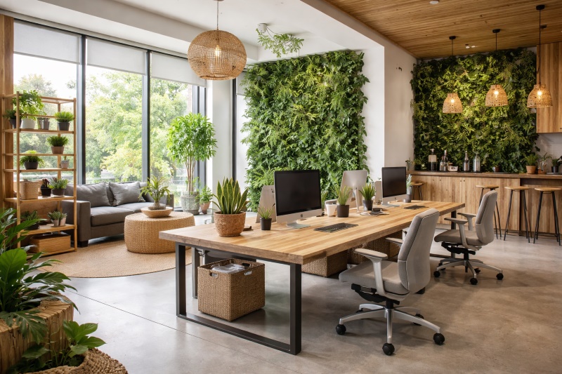 Bringing nature indoors remains a core element of modern office interior design. Biophilic design — using living walls, indoor greenery, natural textures, and organic materials — helps create a calm, refreshing, and wellness-oriented office environment.