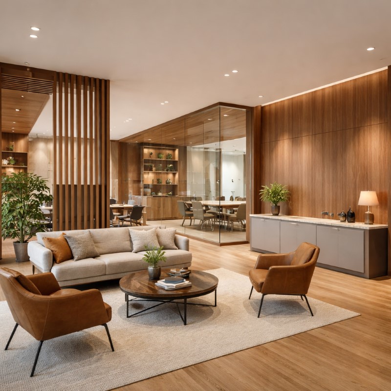 Why it works: Wood connects occupants with nature, softens cold corporate aesthetics, and pairs beautifully with metal, glass, and soft fabrics to deliver a balanced, cozy — yet modern — look.