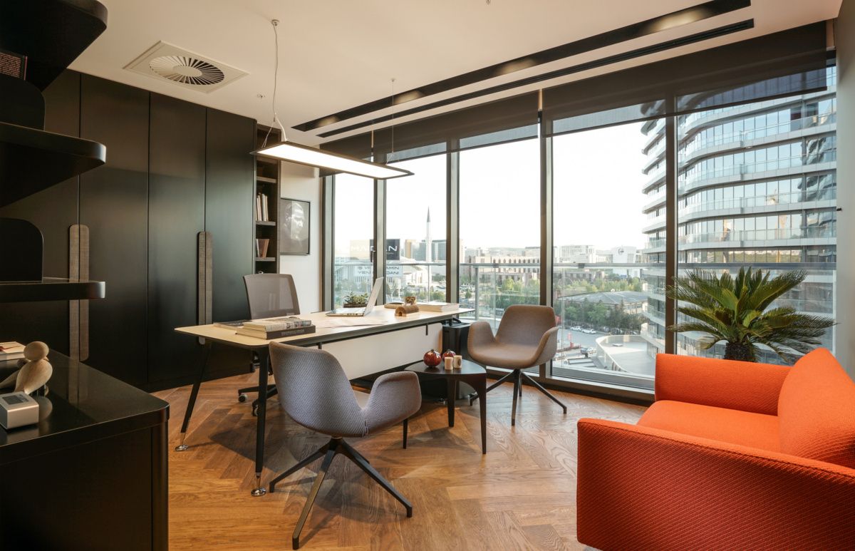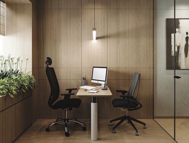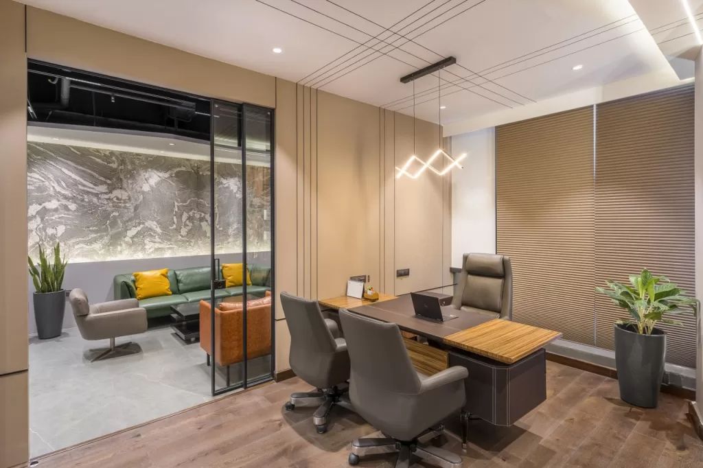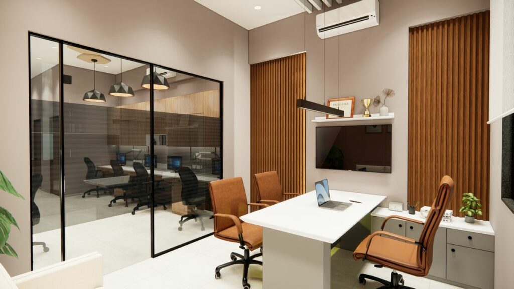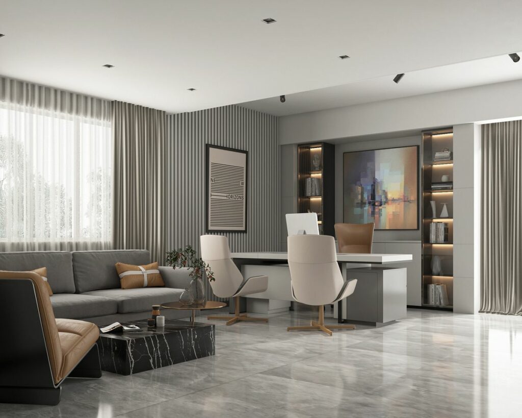 - Furniture: High-quality desks, executive chairs, and side tables create a professional appearance.