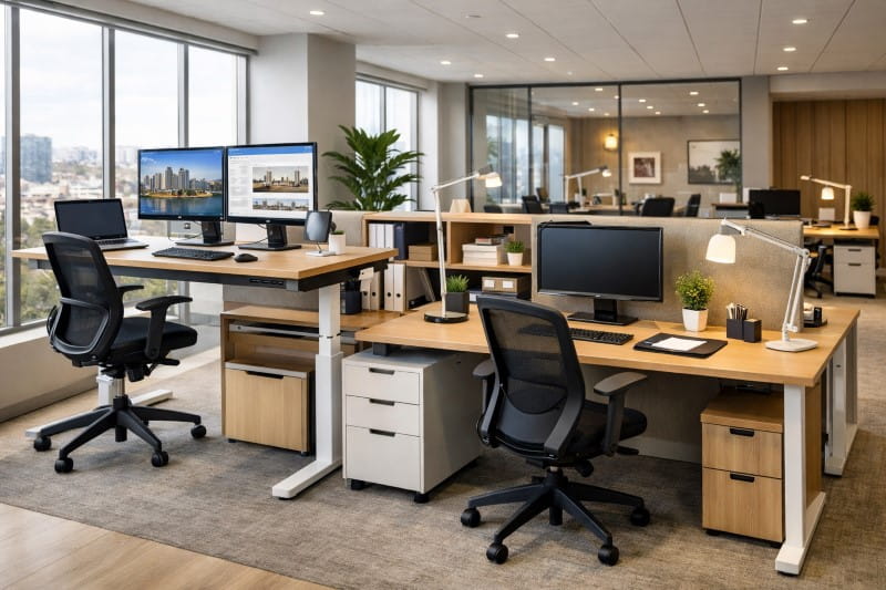 Employee comfort has become a priority. Adjustable desks, ergonomic seating, proper task lighting, and clutter-free storage improve efficiency and reduce fatigue. Designing healthier work environments is a key shift in Trends in Real Estate Office Interior Design, supporting long working hours common in the industry.