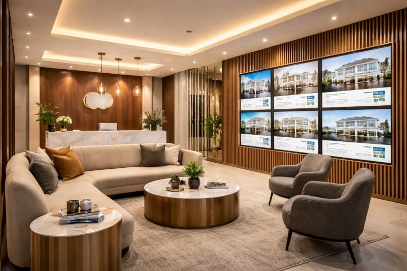 Reception spaces are no longer just waiting areas. Modern reception zones are designed to deliver a strong brand impression through stylish seating, warm lighting, and digital property displays. These client-centric designs are among the most influential Trends in Real Estate Office Interior Design, helping businesses create lasting first impressions.