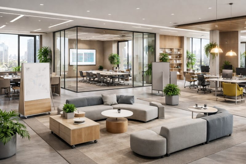 Flexibility is essential for evolving business needs. Movable furniture, multi-purpose meeting rooms, and modular layouts allow spaces to adapt easily. Creating versatile interiors is one of the smartest Trends in Real Estate Office Interior Design for growing property firms.