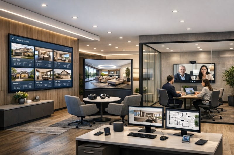 Technology integration is reshaping how real estate offices function. Digital screens for property listings, virtual tour zones, smart lighting systems, and video conferencing setups are now standard features. These tech-driven solutions define the future-focused Trends in Real Estate Office Interior Design.